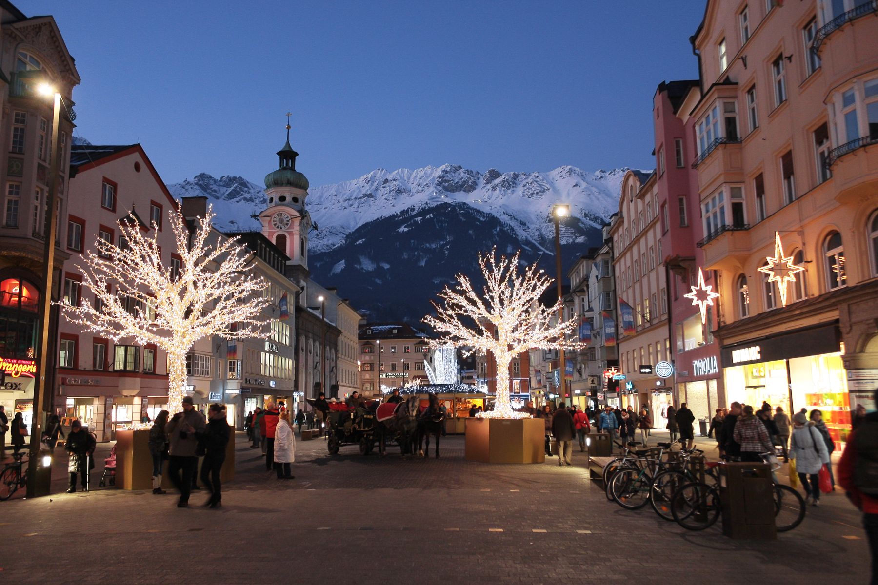 Adventní výzdoba v centru Innsbrucku vytváří jedinečný kontrast mezi zářícími ulicemi a mohutnými zasněženými vrcholy Alp v pozadí.