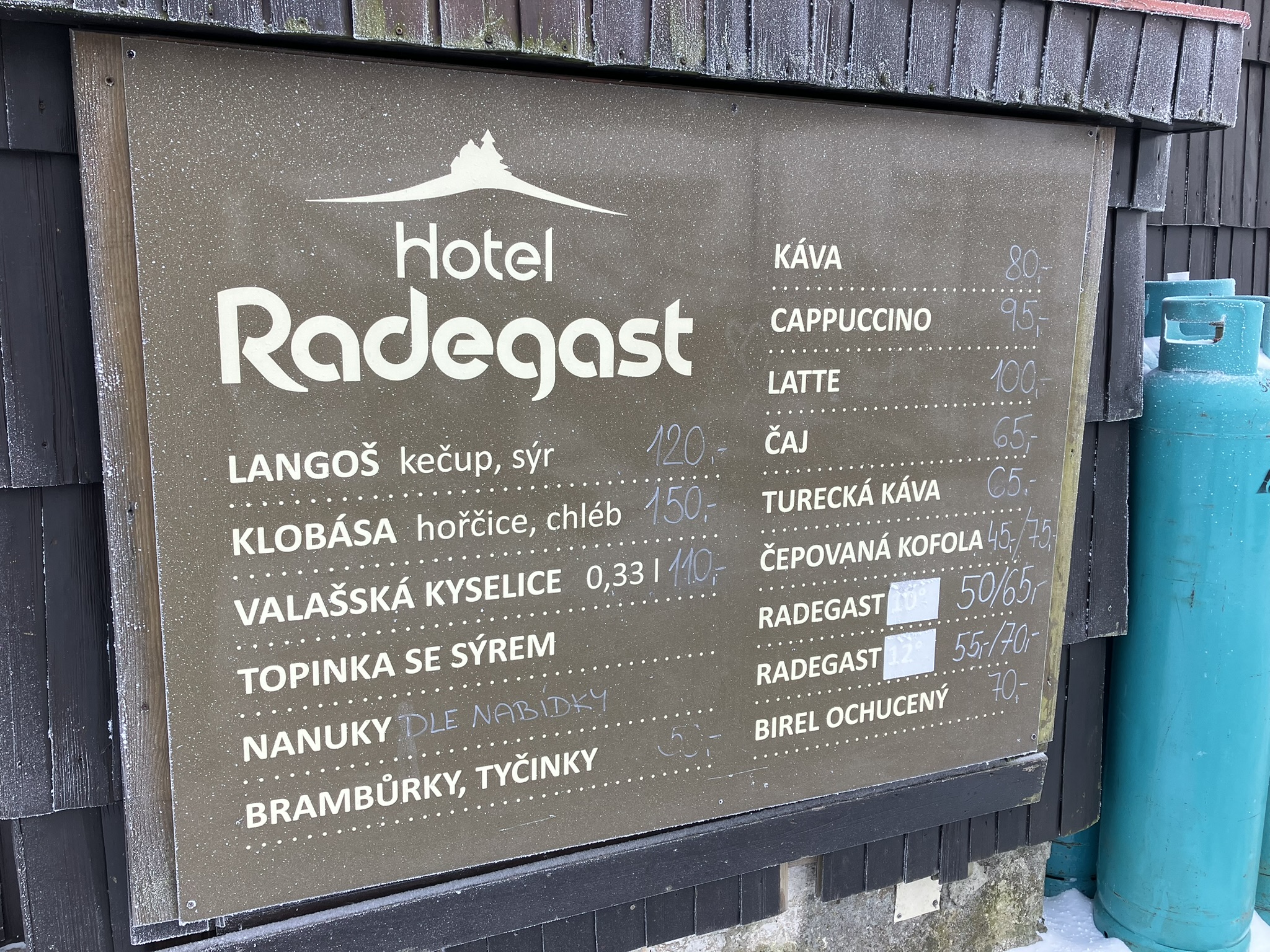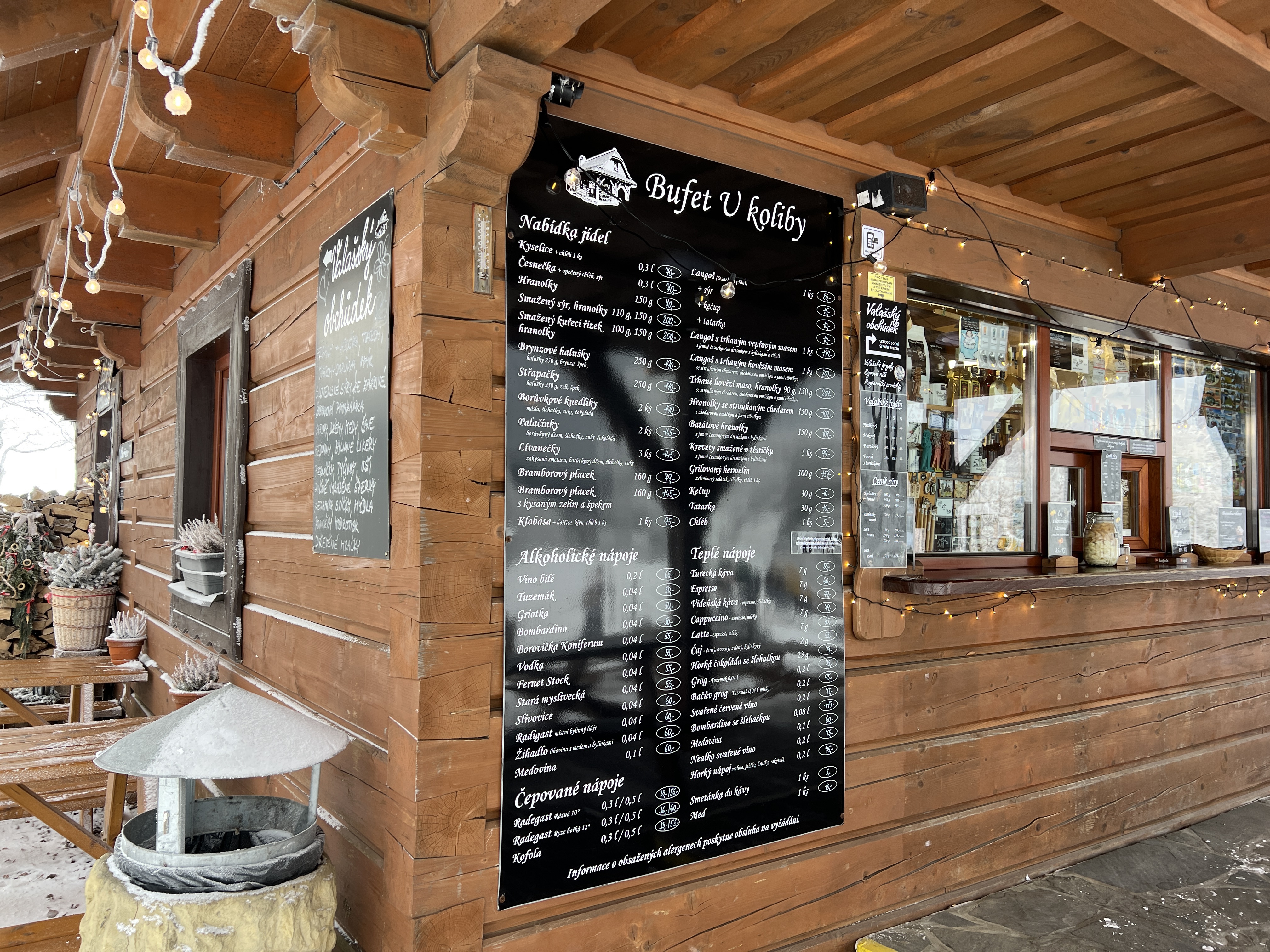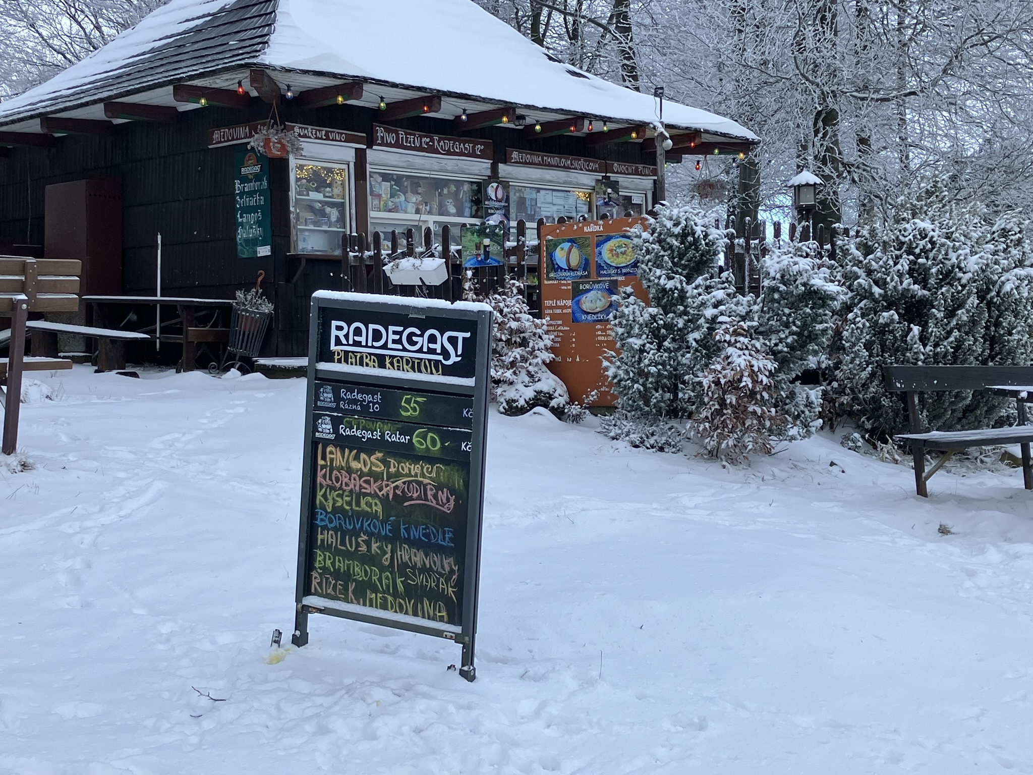 Pokračovali jsme dál směrem k soše Radegasta a ke kapli Cyrila a Metoděje, kde na promrzlé turisty čeká další lákadlo. Vytopená chata, odkud se line vůně čerstvé kyselice a dalších dobrot. Tentokrát jsem pro změnu neodolala já a dala jsem si klobásu a čepované pivo. Stálo mě to 220 korun. Příště budu poučený a raději si sbalím svačinu a čaj do termosky.